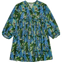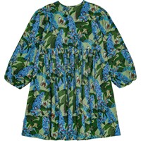 Groene knielange jurk met een wikkeleffect van biologisch katoen. De jurk is ruimvallend met een hoge taille, een rok met veel plooien en lange mouwen met elastiek rond de polsen, zodat je de mouw kunt opstropen. De jurk heeft een all-over print met blauw paarse vlinderstruiken en vlinders in prachtig bijpassende kleuren.