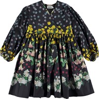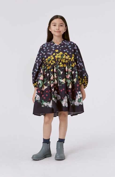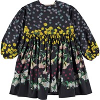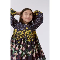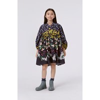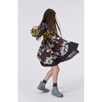 Donkerblauwe knielange jurk met een wikkeleffect en een bloemenprint. De print heeft een donkerblauwe achtergrond en is een combinatie van verschillende bloemen zoals Giant Nightshade en Angel Trumpet. Ze bloeien alleen 's nachts, niet overdag. Ze openen hun bloembladen in het maanlicht als de rest van ons slaapt. Deze jurk is van 100% katoen, heeft een top met wikkeleffect, een hoge taille, lange mouwen en een wijde rok. Het heeft een oversized pasvorm.