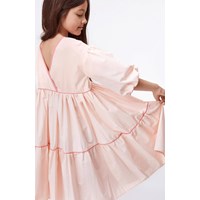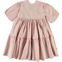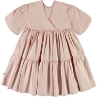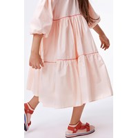 Casta is een volle roze jurk met lichtroze bies. Het heeft mooie grote pofmouwen en een v-hals.