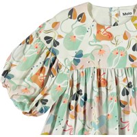 Catherine is een volle lichtgekleurde jurk die mooi valt. Het heeft een pastelkleurige print en pofmouwen. De jurk heeft een ritssluiting aan de achterkant.