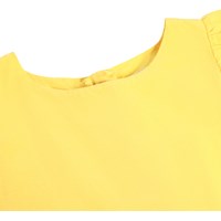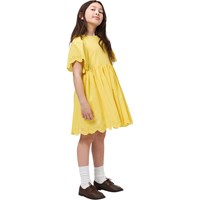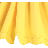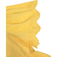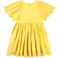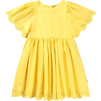 Gele jurk gemaakt van zacht biologisch katoen met prachtig kant aan de mouwen en onderkant. De jurk heeft een rond gesneden, volumineuze rok van lichte katoenpopeline. Het bovenstuk heeft zachte vlindermouwen die zachtjes over de schouders vallen, evenals een blinde rits aan de achterkant voor het gemakkelijk aan- en uittrekken.