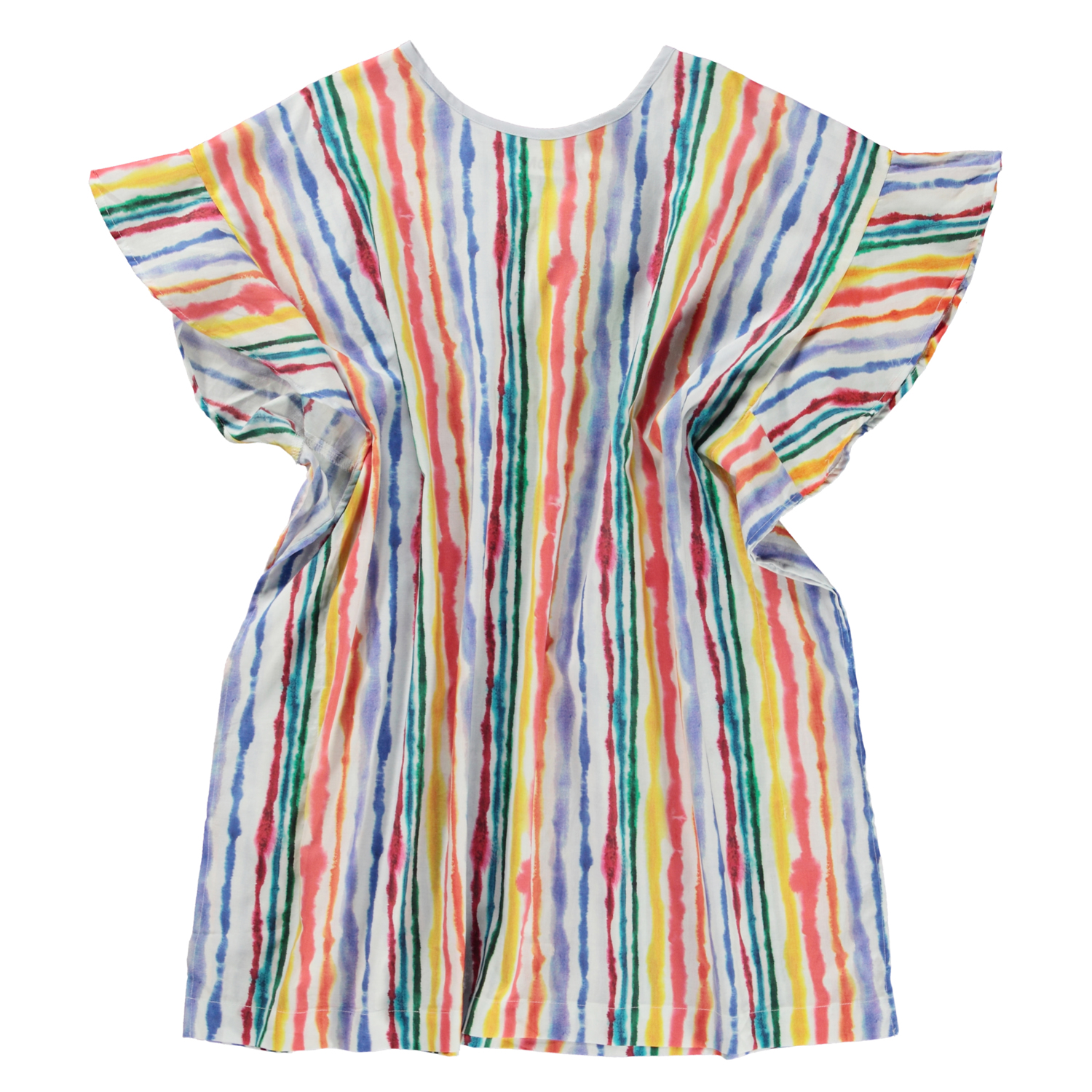 Lichte kleurrijke tuniek van 100% biologisch katoen met ruchemouwen en een print van aquarel strepen. Voor een dagje strand is deze tuniek gemakkelijk te dragen over een badpak. Dit model heeft een zeer ruime pasvorm. Voor een nauwsluitende pasvorm, of voor een kind dat tussen twee maten in zit, raden wij aan een maat kleiner te kopen.