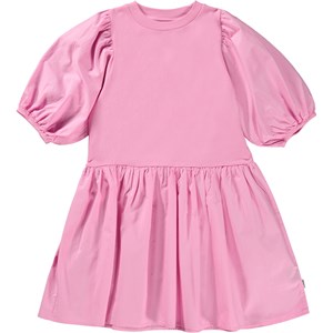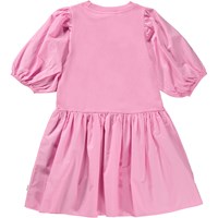 Cece is een roze jurk van biologisch katoen. De jurk heeft een verlaagde taille en pofmouwen met elastiek aan de rand. De mouwen en de rok zijn gemaakt van popeline katoen en de bovenkant van biologisch jersey katoen.