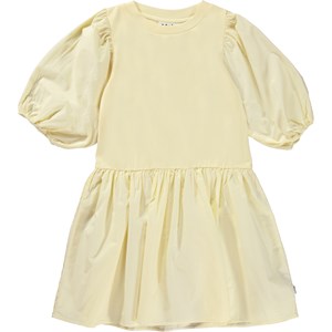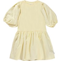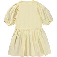 Cece is een gele jurk van biologisch katoen. De jurk heeft een verlaagde taille en pofmouwen met elastiek aan de rand. De mouwen en de rok zijn gemaakt van popeline katoen en de bovenkant van biologisch jersey katoen.