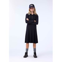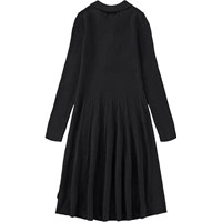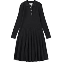 Lange zwarte jurk met lange mouwen gemaakt van een geribbelde wol en katoenmix. De jurk heeft een kleine kraag, kleine knoopjes aan de voorkant en plooien in de rok die volume geven.