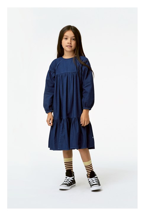 Cecily is een donkerblauwe spijkerjurk met lange mouwen. De jurk heeft een ruimvallende pasvorm met witte naden en een rits aan de achterkant.
