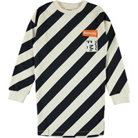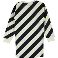 Ceelia is een sweatshirtjurk met lange mouwen met zwarte en witte diagonale strepen. De jurk heeft patches aan de voorzijde en ribboord rond de hals en mouwen.