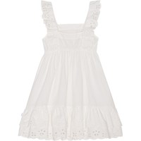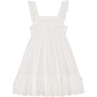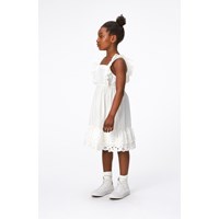Knielange witte jurk van biologisch katoen. De bovenkant van de jurk heeft normale armsgaten en een ingenaaide rucherand, waardoor er mooie ruchesbandjes ontstaan. De jurk heeft een hoge taille met elastiek voor extra volume. De rok heeft een elegante boord van kant die matcht met de ruche aan de bovenkant.