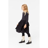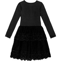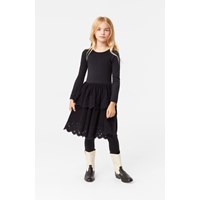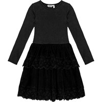 Lange zwarte jurk met lange mouwen van biologisch katoen. Het bovenstuk sluit nauw aan en is gemaakt van geribbelde jersey, terwijl de rok van fluweel is en een elegant kanten patroon van kleine bloemen aan de onderkant heeft.