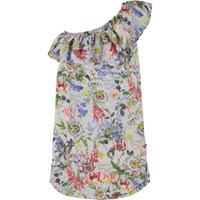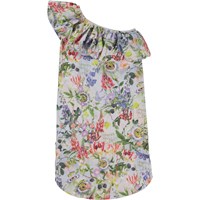 Chadee is een asymmetrische jurk in lichtblauw met een bloemetjes print. De jurk heeft een mooie schuine pasvorm met een grote ruche kraag.