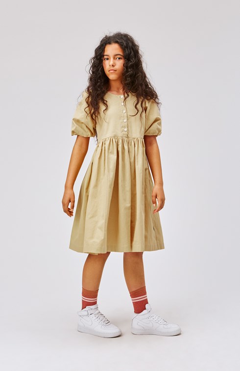 Chaka is een beige knielange jurk in 100% katoen. De jurk heeft korte pofmouwen, witte knoopjes aan de voorkant en een lage rug.