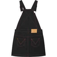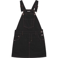 Zwarte spijkerjurk met verstelbare bandjes voor de perfecte pasvorm. De jurk heeft een vaste tailleband met riemlussen, een grote borstzak en praktische drukknopen aan de zijkant voor gemakkelijk dragen. Het onderste deel van de jurk is voorzien van voorzakken en twee achterzakken, en het wordt afgemaakt met een leren logopatch die past bij de gedetailleerde stiksels op de jurk.