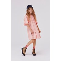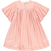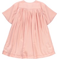 Chalice is een gedrapeerde lichtroze druk in een bell pasvorm met wijde mogen en een knoopsluiting in de hals.