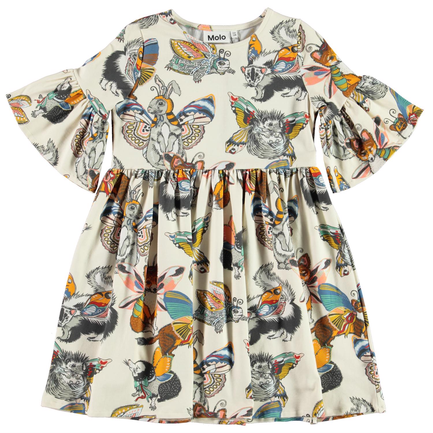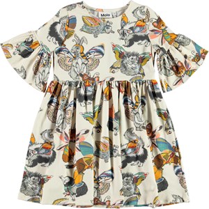 Chasity is een lichtgekleurde jurk met een print van bosdieren met vleugels. Kun jij de verschillende dieren herkennen zelfs met vleugels? Het heeft een elastische taille en pofmouwen.