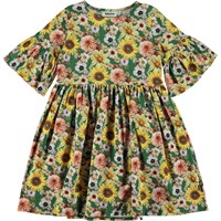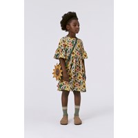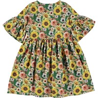 Groene knielange jurk in een  bloemenprint in geeltinten met wijde mouwen. Deze print heeft een retro 70's stijl als een oud zomerhuis dat je doet denken aan iets moois en geruststellends. Het doet ons ook denken aan een vintage hoes op een rieten bank. Deze jurk is van 100% katoenen jersey, heeft een ronde hals, een hoge taille, een gerimpelde rok en wijde mouwen. Het heeft een ruimvallende pasvorm.