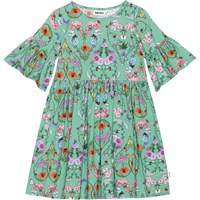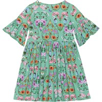 Groene jurk van zacht biologisch katoen jersey. Het heeft lange geplooide mouwen met een ronde hals en een wijde rok in een ruimvallende pasvorm. De jurk heeft een kleurrijke print van hartjes die zijn gemaakt door insecten en wilde bloemen.