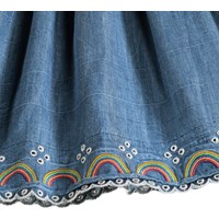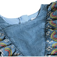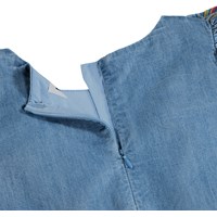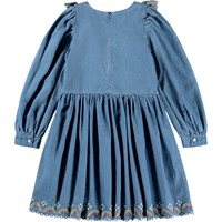Spijkerjurk met lange mouwen en kant gemaakt van zacht biologisch katoen. De jurk heeft een ruimvallende pasvorm, een ruche aan de voorkant die een V vormt en een taille naad die lichte plooien en volheid toevoegt aan de knielange rok. De jurk sluit met een blinde rits aan de zijkant en achterkant en combineert prachtige details met hoog comfort.