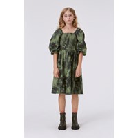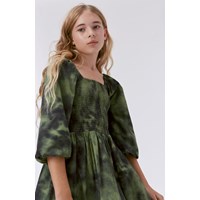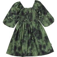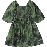 Groene midi jurk met een tie-dye print in verschillende tinten groen. Deze jurk is van 100% katoen, heeft een vierkante hals, 3/4 lange mouwen met elastiek, top met elastisch smokwerk en een wijde rok. Deze jurk heeft een normale pasvorm. De tie-dye print van Molo is uniek en met de hand gemaakt, waardoor de print per stijl kan verschillen.