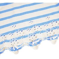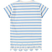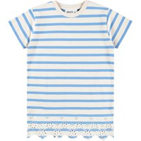 Blauw en off-white T-shirtjurk gemaakt van zacht katoen met een ronde hals en ribboorden. De jurk heeft een ruimvallnde en relaxte pasvorm en is afgewerkt met een prachtige kanten boord.