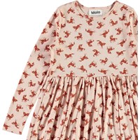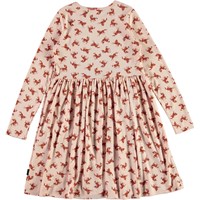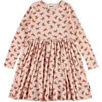 Cheyanne is een roze jurk met lange mouwen en een print van kleine paarden. De jurk is licht en zacht. Cheyanne heeft een elastische tailleband.