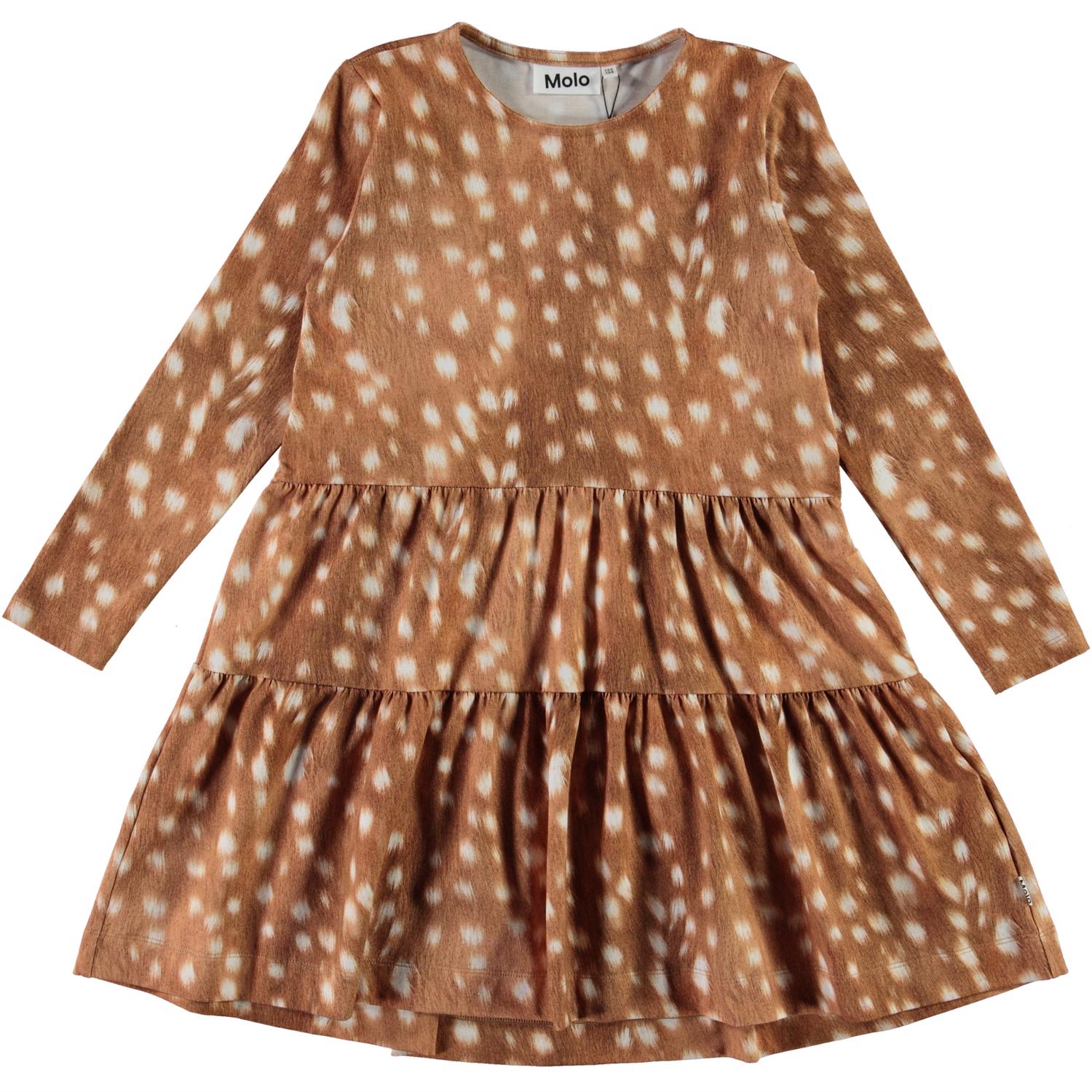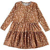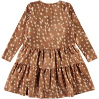 Chia is een bruine jurk met een print van witte vlekjes die lijken op de vacht van een hert. De jurk heeft lange mouwen en een losse, comfortabele pasvorm.