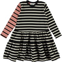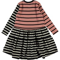 Chia is een zwart en wit gestreepte jersey druk met lange mouwen. Een mouw is in roze en zwart gestreept. Chia heeft een volle gedrapeerde rok.