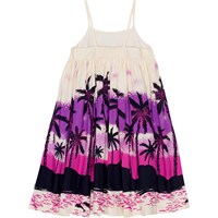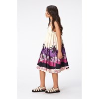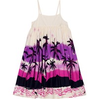 Gebroken witte mouwloze jurk van biologisch katoen met een hoge taille, een wijde rok en smalle schouderbandjes. Door de verborgen rits in de zijnaad trek je de jurk gemakkelijk aan en uit. De jurk heeft een print van een onbewoond eiland in tinten van paars, roze en zwart dat je doet denken aan een Hawaiiaanse zomer.
