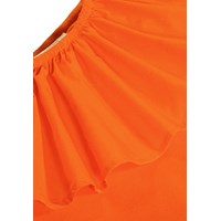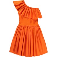 Rode asymmetrische jurk van zacht biologisch katoen met een aansluitende ribtop en een knielange, cirkelvormige lichte katoenen poplin rok die volume en beweging geeft. Langs de hals loopt een brede poplin ruche, die de jurk een speelse en vrouwelijke uitstraling geeft.