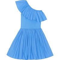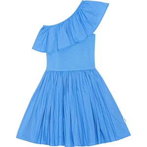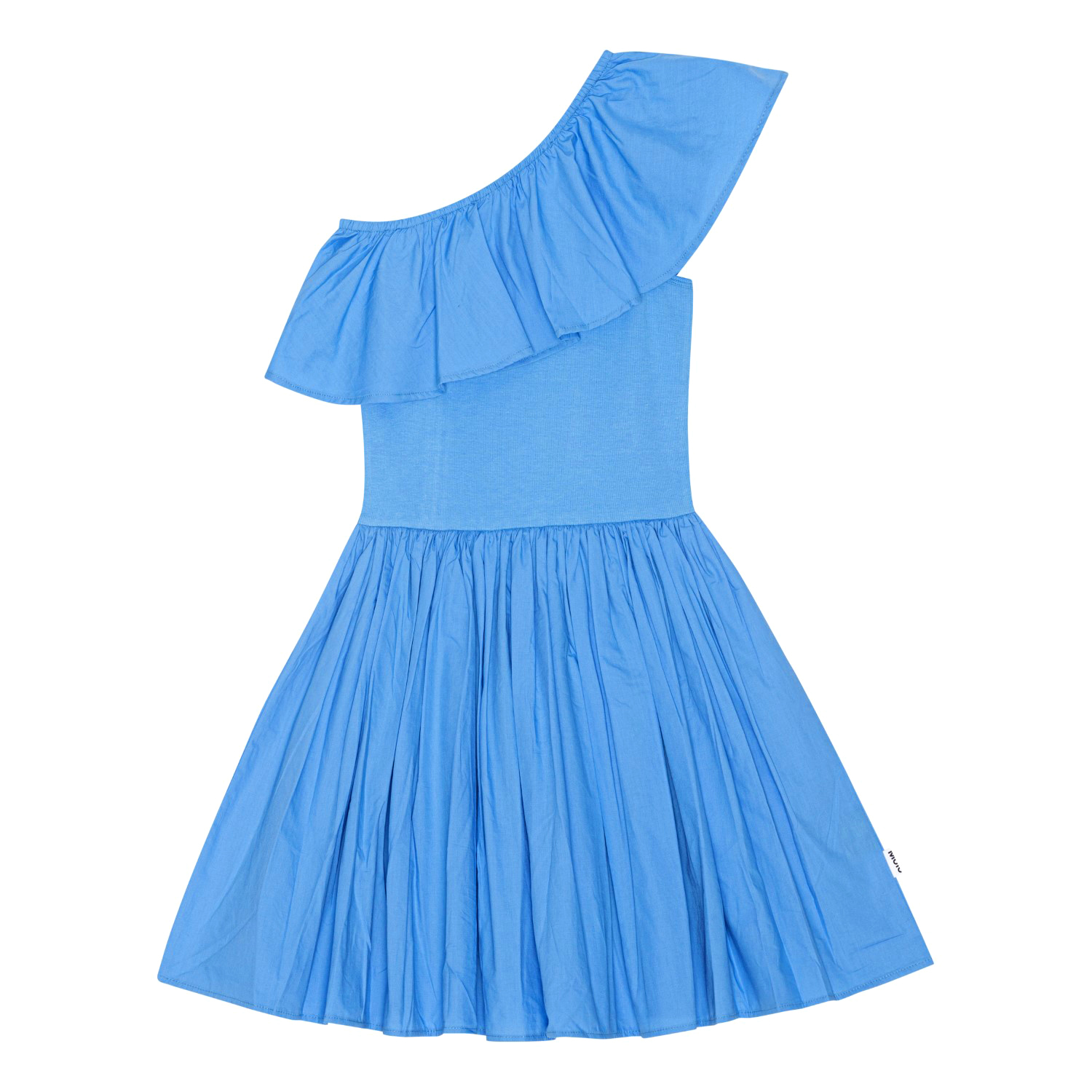 Blauwe one shoulder jurk van biologisch katoen. De jurk heeft een brede poplin ruche rond de hals en een nauwsluitende lijfje van ribstof. De cirkelrok is volumineus en heeft een knielengte.