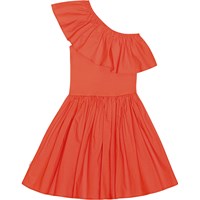 Rode one shoulder jurk van biologisch katoen. De jurk heeft een brede poplin ruche rond de hals en een nauwsluitende lijfje van ribstof. De cirkelrok is volumineus en heeft een knielengte.