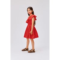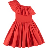 Chloey is een rode asymmetrische jurk met ruches en een ronde rok van biologisch katoen. De top van Chloey is van rib jersey met een poplin ruches en de rok is van popeline katoen. De rok is geplooid in de taille om hem volumineus te maken en gemakkelijk om in te bewegen. De jurk is perfect voor zowel feestjes als dagelijks gebruik.