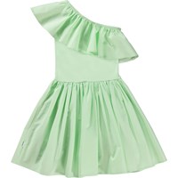 Chloey is een mintgroene asymmetrische jurk met ruches en een ronde rok van biologisch katoen. De top van Chloey is van rib jersey met een poplin ruches en de rok is van popeline katoen. De rok is geplooid in de taille om hem volumineus te maken en gemakkelijk om in te bewegen. De jurk is perfect voor zowel feestjes als dagelijks gebruik.
