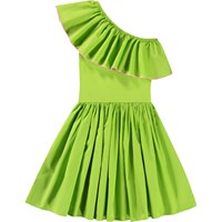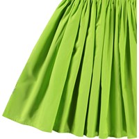 Groene asymmetrische jurk van biologisch katoen. De jurk heeft een wijde poplin ruche rond de hals, een aansluitende ribtop en een knielange cirkelrok met veel volume.
