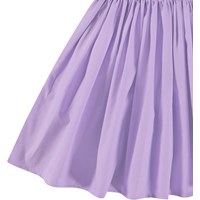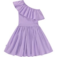 Paarse asymmetrische jurk van biologisch katoen. De jurk heeft een wijde poplin ruche rond de hals, een aansluitende ribtop en een knielange cirkelrok met veel volume.