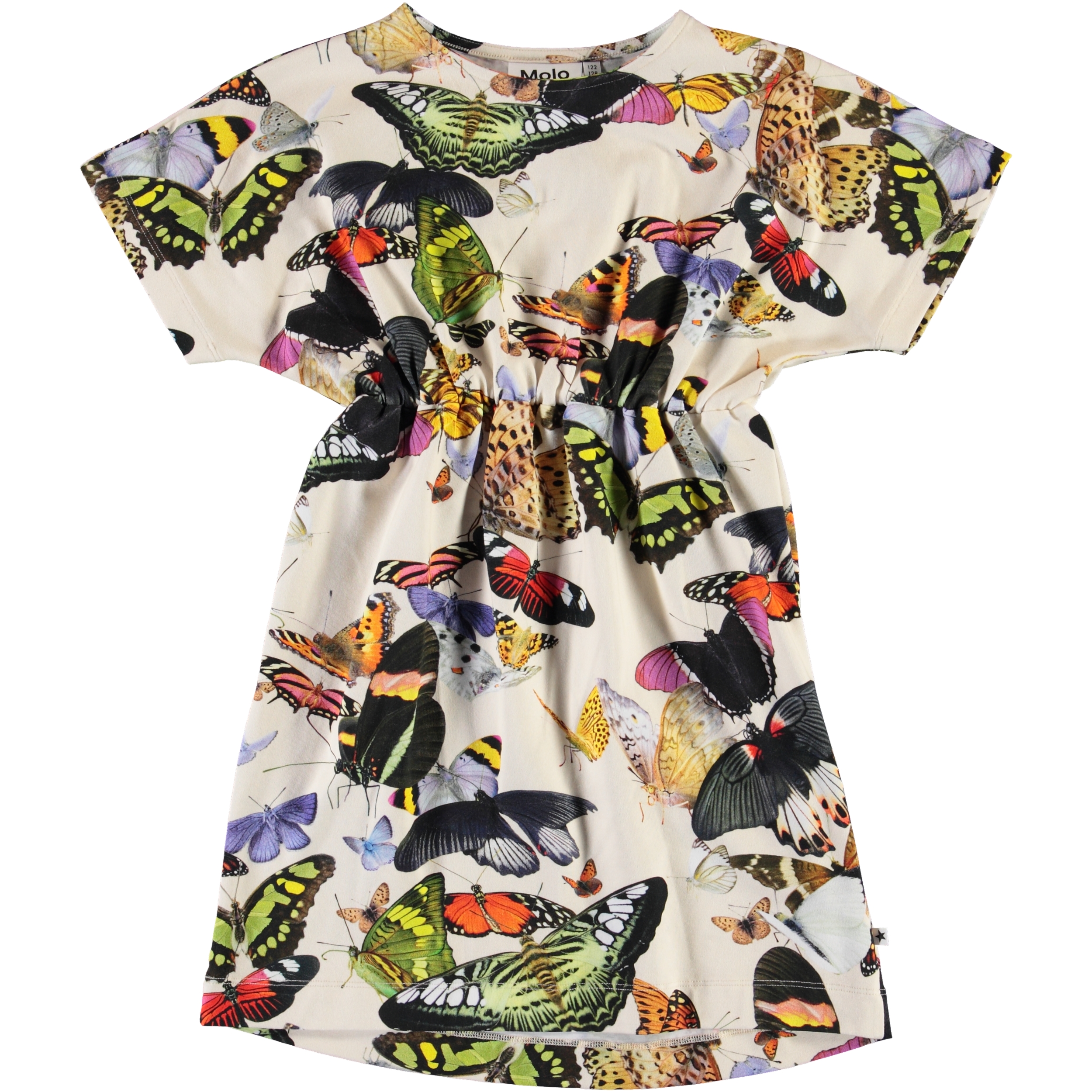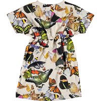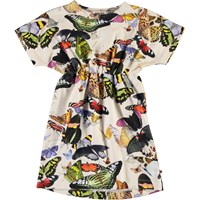Word een deel van de caleidoscoop van vlinders op de Christa- urk. De jurk heeft korte mouwen en plooitjes rond de middel, wat het een mooie vorm geeft.