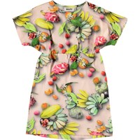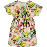 Christa is een jurk in de 'Tutti Frutti'-print, die is gevuld met tropisch fruit. De jurk heeft korte mouwen en plooitjes rond de middel, wat het een mooie vorm geeft.