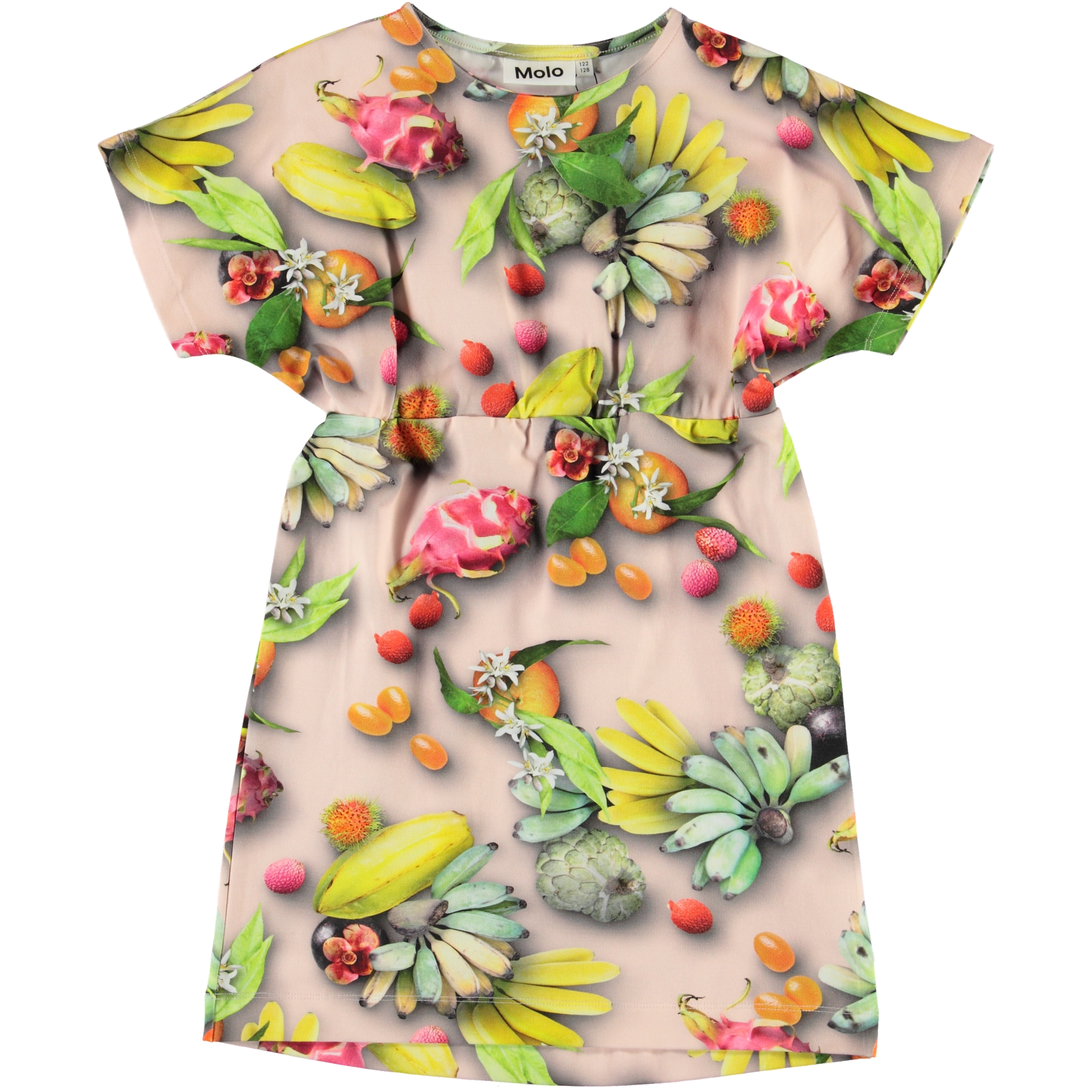 Christa is een jurk in de 'Tutti Frutti'-print, die is gevuld met tropisch fruit. De jurk heeft korte mouwen en plooitjes rond de middel, wat het een mooie vorm geeft.