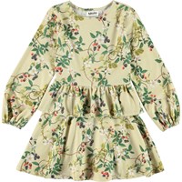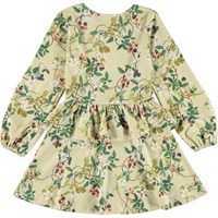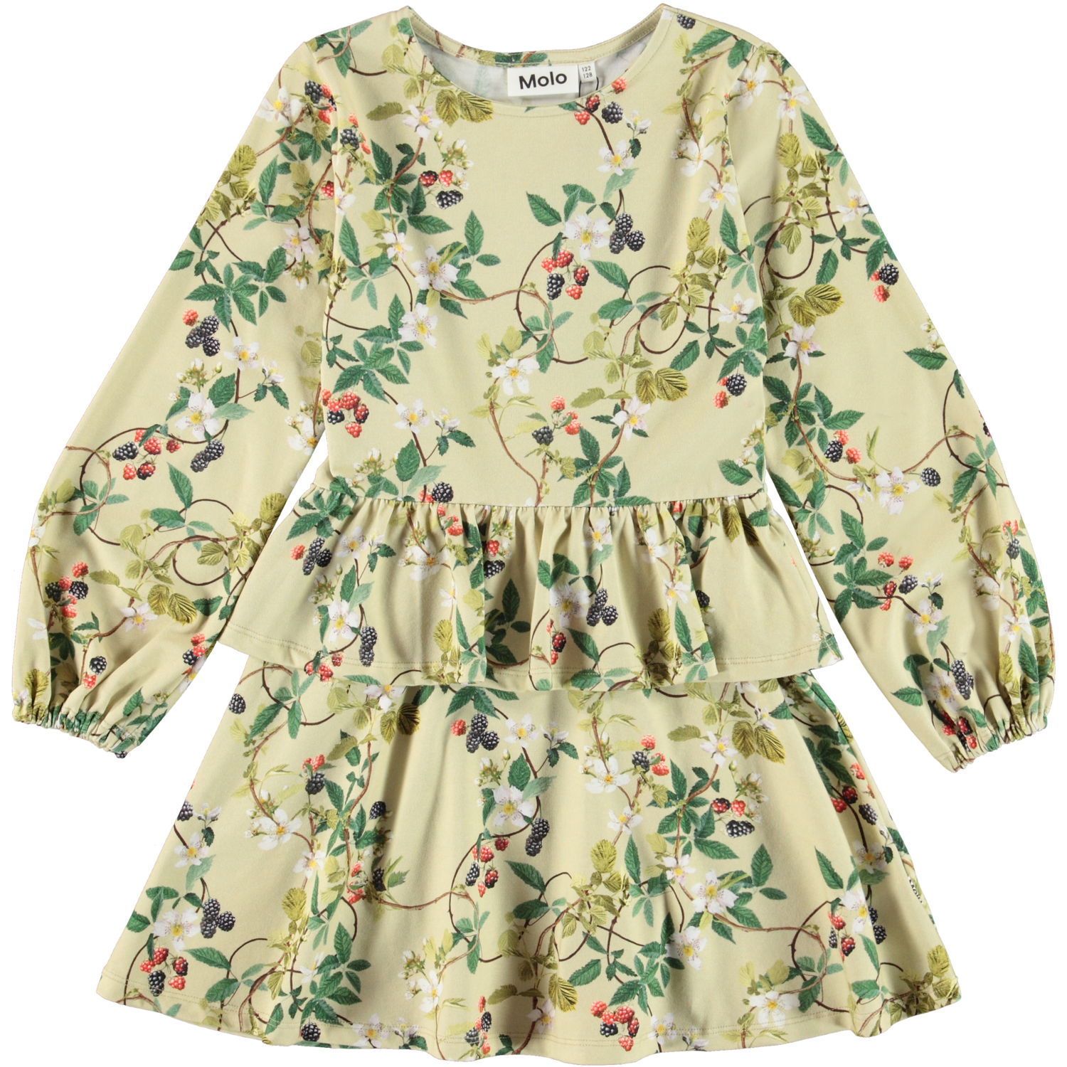 Christabelle is een lichtgroene jurk met lange mouwen en een print van bramenstruiken. De jurk heeft een peplum en iets wijde mouwen Christabelle is een zwarte jurk met lange mouwen en een print van bloemetjes. De jurk heeft een peplum en iets wijde mouwen