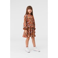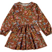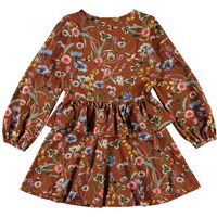 Christabelle is een bruine jurk met lange mouwen en een print van wilde bloemen en kleine insecten. Het heeft een peplum rok en volle mouwen.