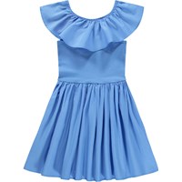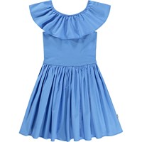 Blauwe jurk gemaakt van zacht biologisch katoen met een aansluitende geribde jersey top en ronde hals. De jurk heeft een volumineuze, cirkelvormig gesneden rok van lichte katoenpopeline, die een mooi contrast vormt met de eenvoudige top. De top is mouwloos en heeft een grote rucheskraag die zowel op de schouders als van de schouders gedragen kan worden.