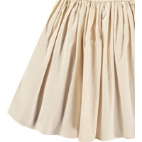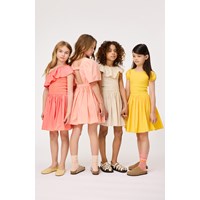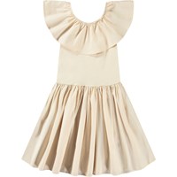 Roze jurk van biologisch katoen met een aansluitende jersey ribtop, ronde hals en een rok met volume van katoen poplin. De top is mouwloos met een grote ruche kraag die zowel over als langs de schouder gedragen kan worden.