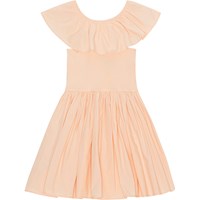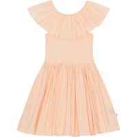 Perzikkleurige jurk van biologisch katoen met ruchekraag. De bovenkant van de jurk is mouwloos van zacht katoenen ribstof met een grote kraag met ruches die omhoog of omlaag op de schouders kan worden gedragen. De rok is wijd en heeft plooien in de taille.