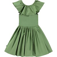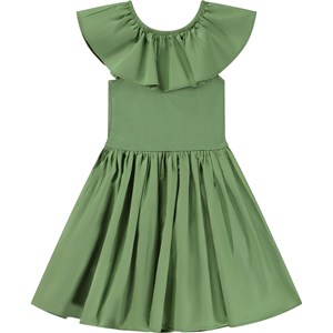Groene knielange jurk met popeline kraag en rok. De popeline kraag heeft elastiek en kan omhoog gedragen worden als een kraag of los van de schouders als mouwen. Het lijfje van deze jurk is van 100% katoenen jersey, terwijl de kraag en rok van 100% katoenen popeline zijn, de jurk is slim fit. Je kunt de jurk stylen met een top met lange mouwen en een panty voor koude dagen, of je kan het alleen dragen op zonnige en warmere dagen.