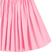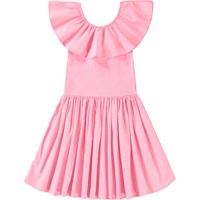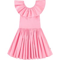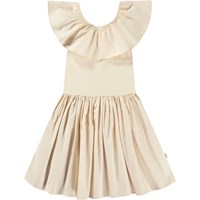 Beige jurk van biologisch katoen met een aansluitende jersey ribtop, ronde hals en een rok met volume van katoen poplin. De top is mouwloos met een grote ruche kraag die zowel over als langs de schouder gedragen kan worden.