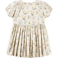 Gebroken witte jurk gemaakt van zacht biologisch katoen met kleine pofmouwen en fijne plooien rond de hals. Een blinde rits aan de achterkant maakt het gemakkelijk om het aan- en uit te trekken. De rok is rijk aan plooien, wat extra volheid en een lichte en luchtige uitstraling geeft. De jurk is versierd met een kleurrijke bloemenprint die het levendig maakt en een zomerse sfeer toevoegt.