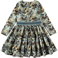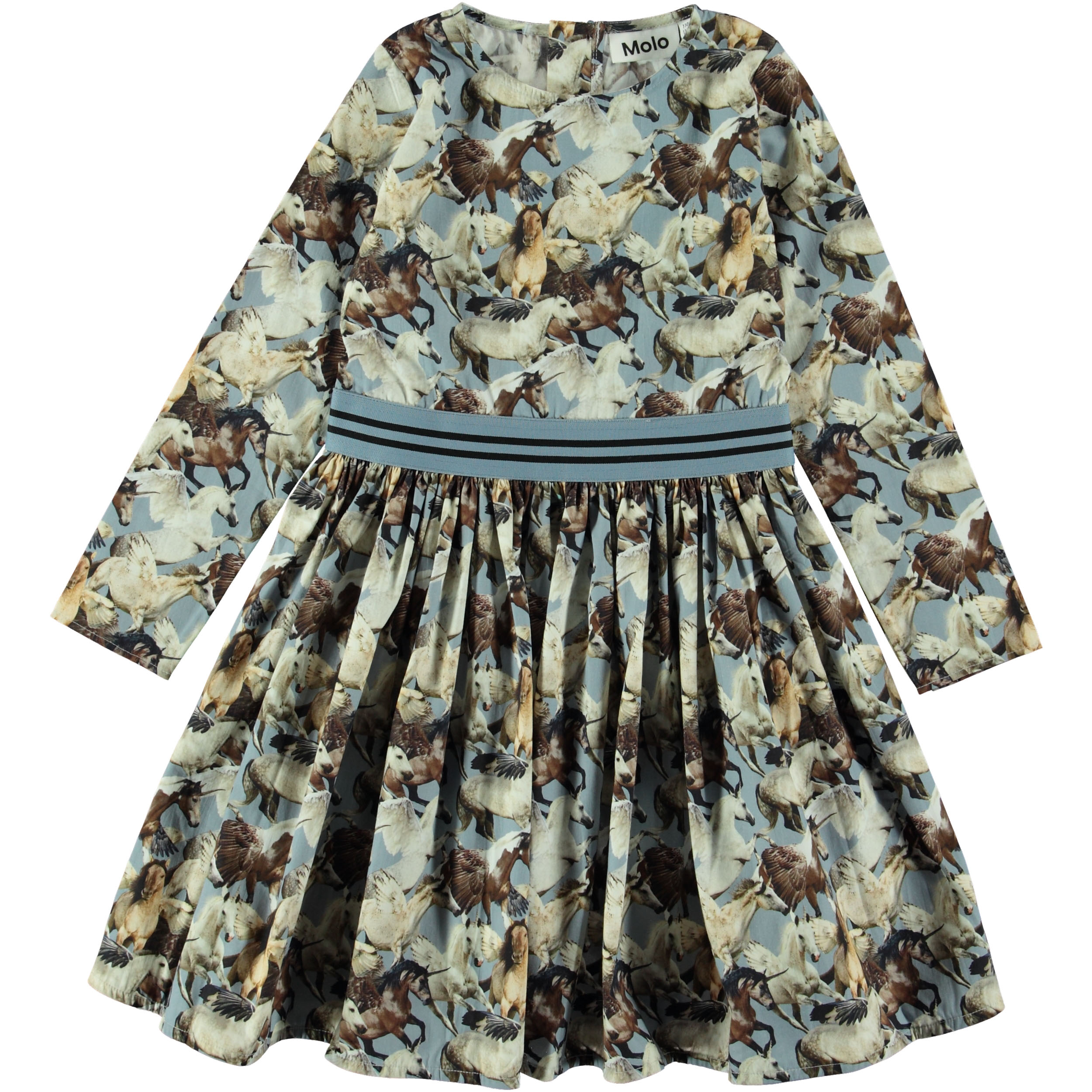 Christin is een poplin jurk met de 'Celestial Unicorns' print. Christin heeft lange mouwen, een gestreepte band in de taille en een ritssluiting aan de achterkant.