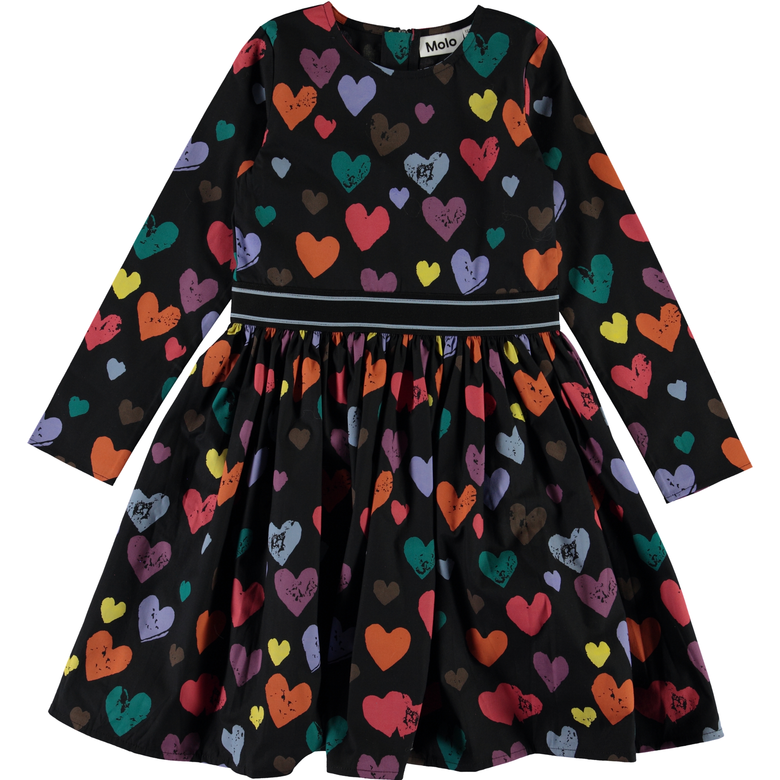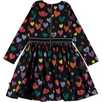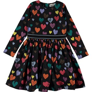 Christin is een zwarte jurk met lange mouwen gevuld met liefde in de vorm van hartjes in verschillende kleuren. De jurk heeft een gestreepte band in de taille en een rits aan de achterkant.