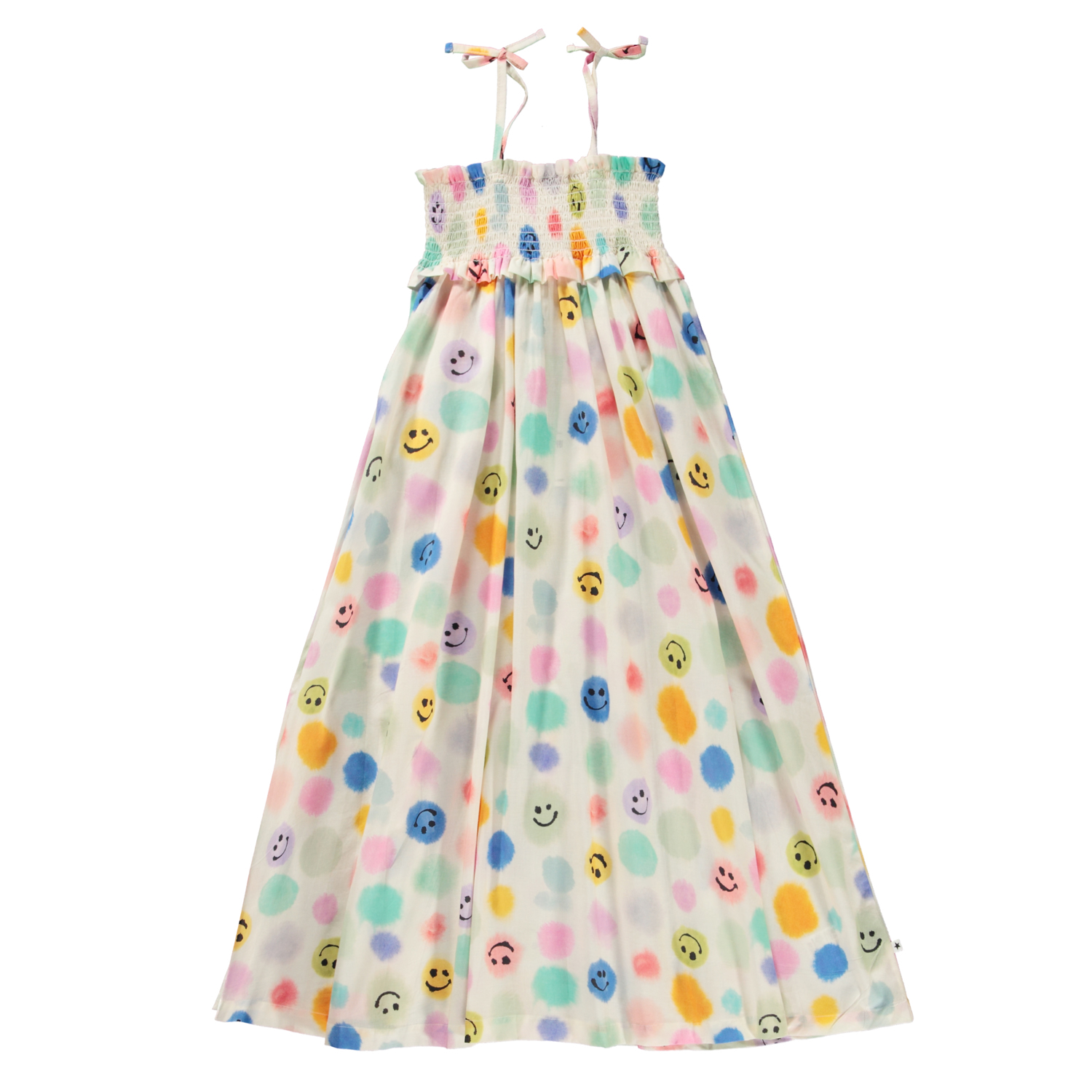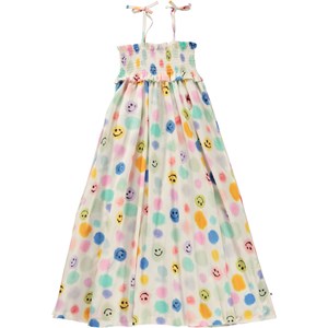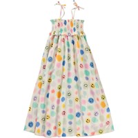 Lange lichtgewicht zomerjurk van 100% biologisch katoenmet schouderbandjes. De print bestaat uit pastelkleurige stippen, waarvan sommige emojis zijn. De bovenkant van de jurk is gesmokt en de schouderbandjes zijn verstelbaar voor een comfortabele pasvorm in de zomerse hitte. De jurk heeft een normale pasvorm.
