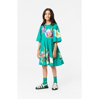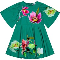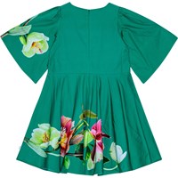 Knielange groene jurk van biologisch katoen met wijde vlinder mouwen die reiken tot de elleboog. De rok van de jurk heeft royale plooien, wat de jurk volume geeft. Makkelijk aan te trekken met de blinde rits aan de achterkant. De jurk heeft een print van prachtige kerstrozen in witte en roze tinten.