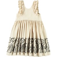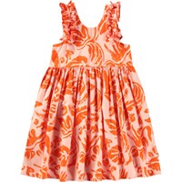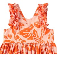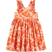 Lichtoranje knielange jurk van biologisch katoen met ruches rond de armsgaten. De jurk heeft een ruimvallende pasvorm met een v-hals aan de achterkant en een all over print van oranje bladeren en de tekst 'We are Nature'.